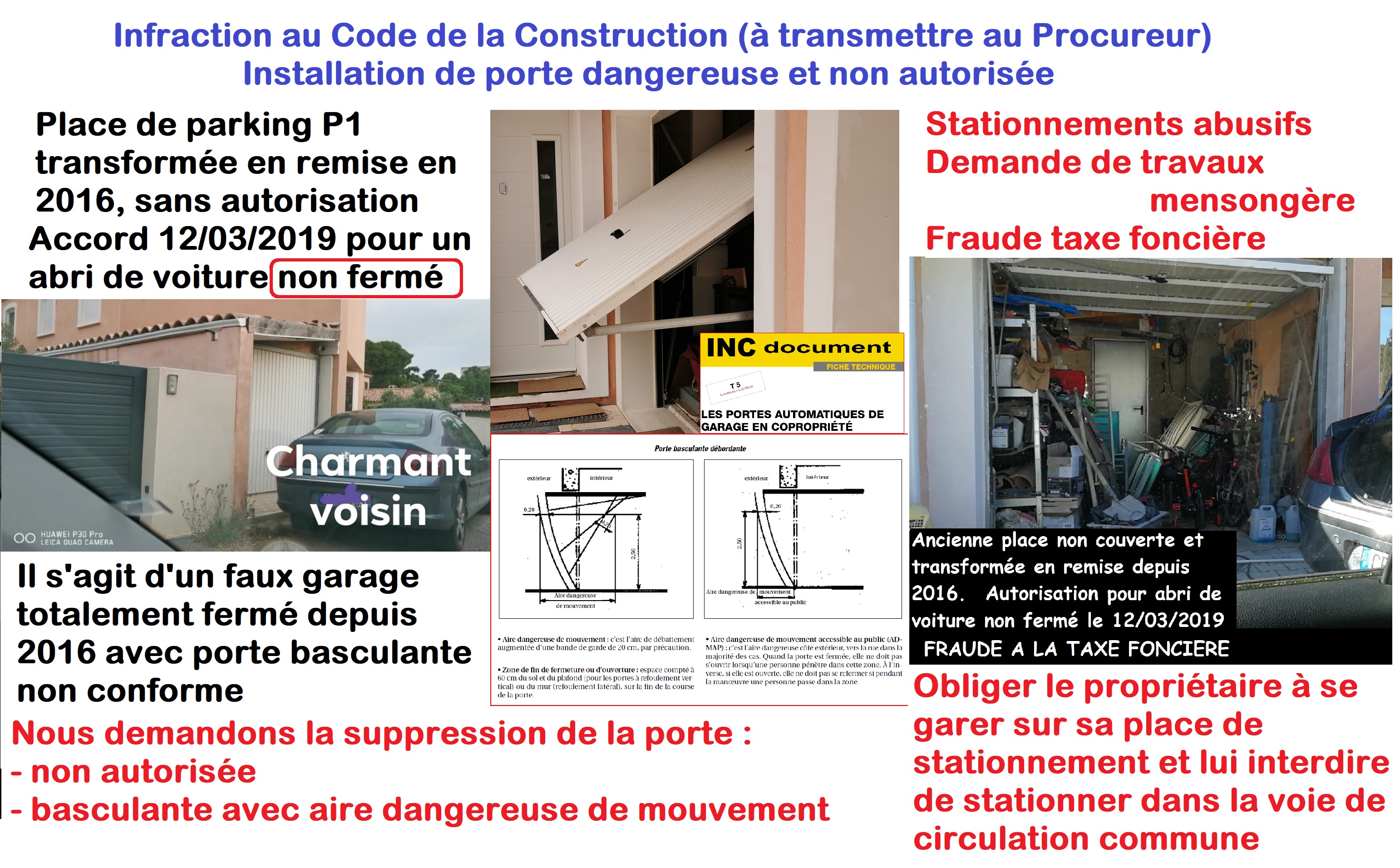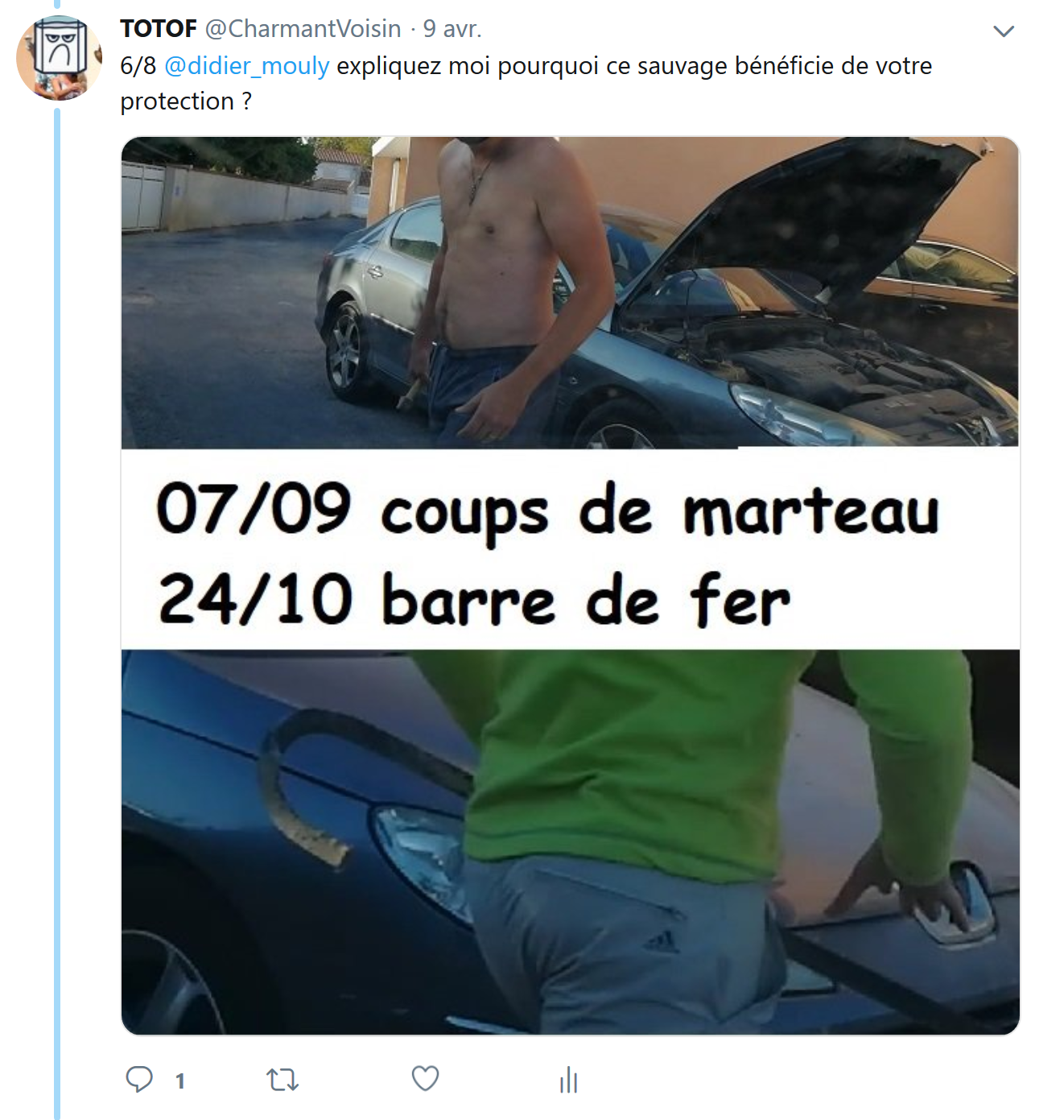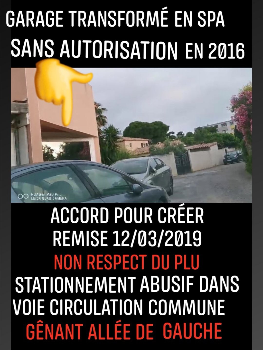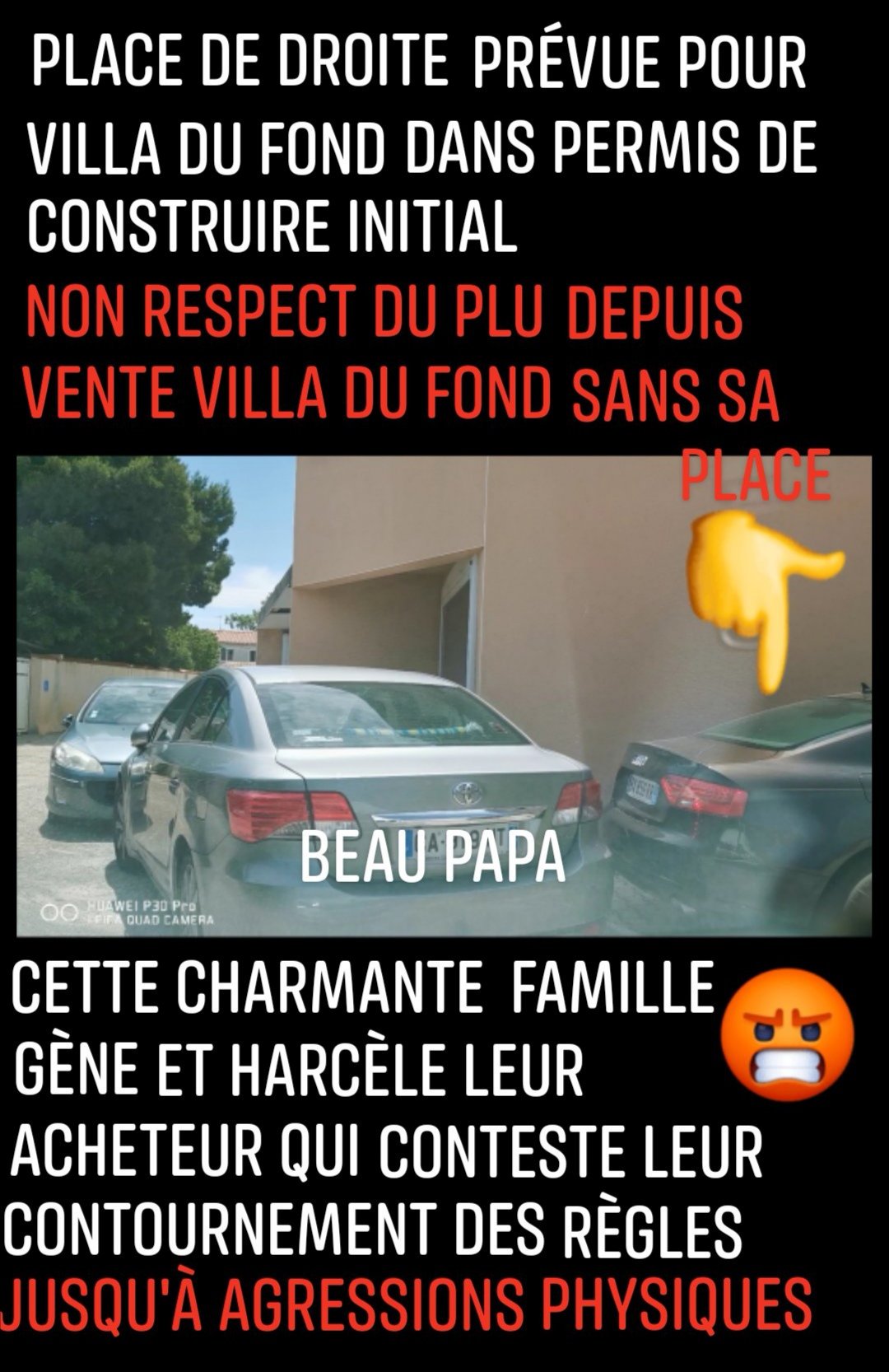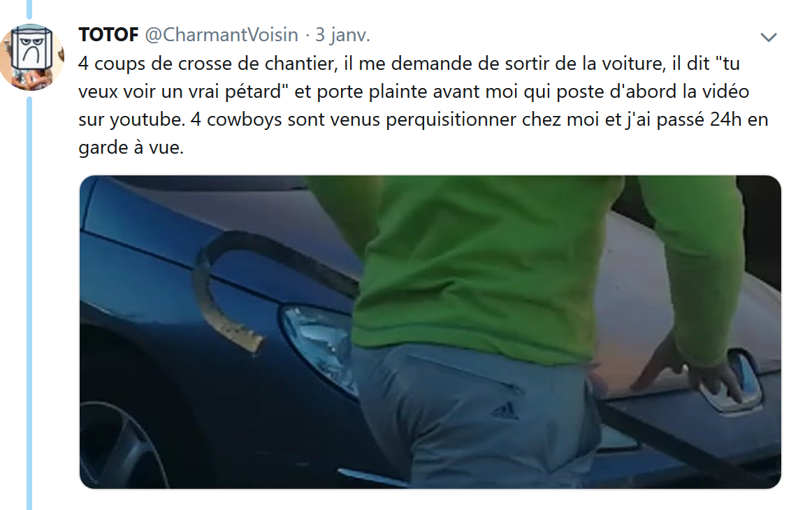 Après avoir pris des photos d’un nouveau stationnement volontairement gênant, le charmant voisin me lance un galet depuis son toit terrasse.