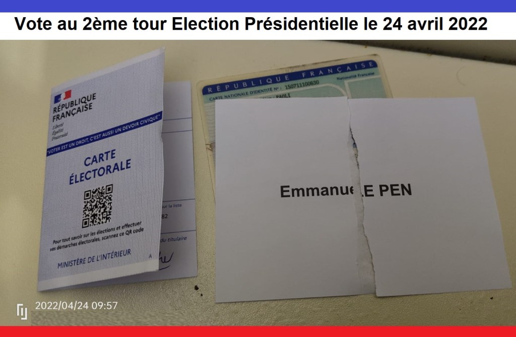 Je ne regrette pas d’avoir soutenu et voté pour le Président en 2017 mais je n’ai pas voté pour lui au 1er tour et au 2ème tour en avril 2022. Je souhaitais voter blanc. Comme ce n’est pas pris en compte j’ai déchiré les bulletins des 2 candidats restant, jeté la moitié et inséré dans l’enveloppe le prénom de l’un et le nom de l’autre. J’ai donc voté « Emmanuel LePen » et je trouve franchement nul que mon vote soit compté comme nul.