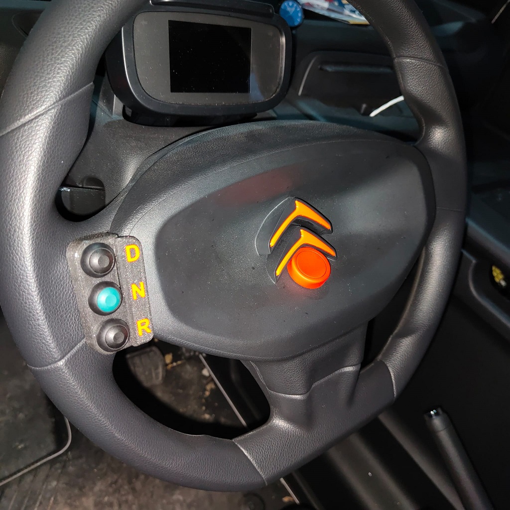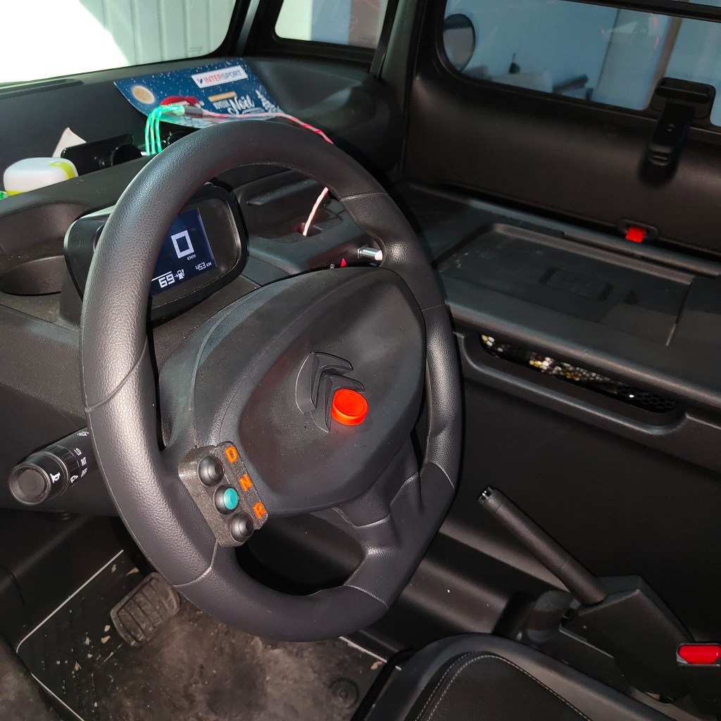J’utilise donc les nouvelles commandes DNR au volant. Notez les petits chevrons de couleur orange autocollés au milieu du volant, imprimés en 3D et fournis par le même Fred que je tiens ici à remercier.