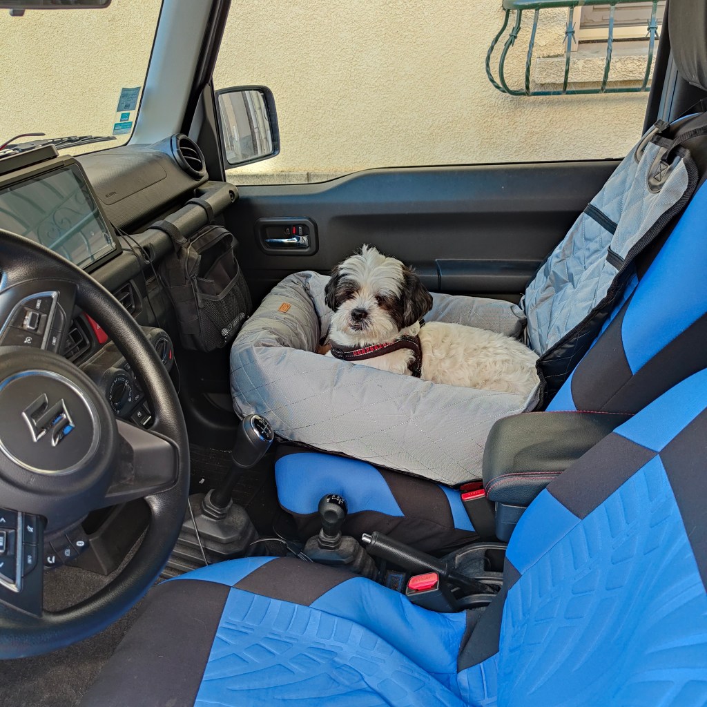 Sur la planche prévue pour poser une tablette, j’ai mis un grand coussin pour y installer mon petit chien Pampito. Par sécurité Pampito est tout de même tenu par son collier. Aucun risque toutefois qu’il ne passe par le pare-brise en cas de freinage ou de choc à 45 Km/h maxi et compte tenu de la longueur avant d’atteindre le pare-brise.