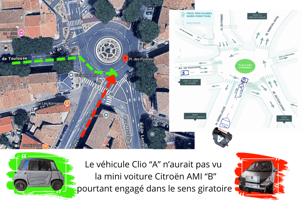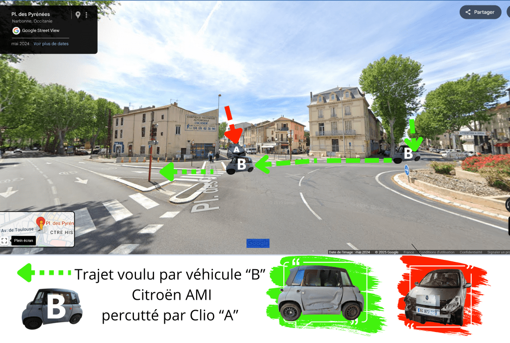 Le 27/08/2025 une véhicule a foncé dans le rond point où j’étais engagé Place des Pyrénées à Narbonne et a percuté et poussé mon véhicule coté portière Pampito. Ce dernier a été poussé vers l’arrière de mon siège conducteur et n’a pas été blessé.