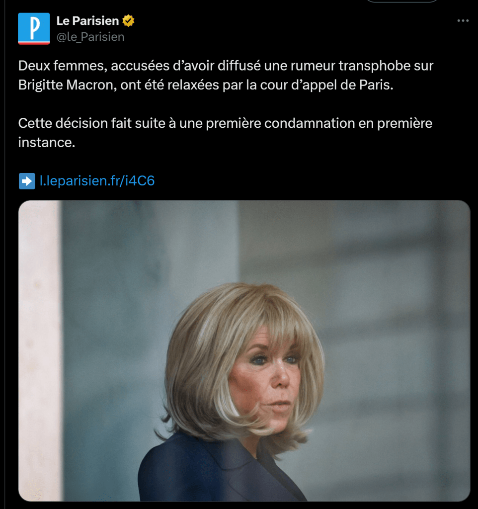Ce 10 juillet 2025, la Cour d’appel de Paris a prononcé la relaxe de Natacha Rey et Amandine Roy qui étaient poursuivies par Brigitte Macron à la suite d’une vidéo diffusée le 9 décembre 2021 dans laquelle elles affirmaient en substance que Brigitte Macron était née homme sous le nom de Jean-Michel Trogneux. En janvier 2022, Brigitte Macron avait annoncé son intention de porter plainte pour diffamation et avait obtenu la condamnation de Natacha Rey et d’Amandine Roy le 12 septembre 2024. Ayant fait appel de cette condamnation, ces dernières viennent donc d’être relaxées, ce qui signifie que le tribunal a déclaré les prévenues non coupable d’une infraction. Il s’agit d’une victoire majeure car cela signifie que, dans l’affaire Trogneux, malgré tout le tintamarre médiatique, Brigitte Macron n’a obtenu AUCUNE condamnation pour diffamation contre ceux qui affirment qu’elle est née homme sous le nom de Jean-Michel Trogneux. Pour rappel, Brigitte Macron est l’ « épouse » d’Emmanuel Macron qu’elle a connu en 1992 alors que le futur président français était âgé de 14 ans.